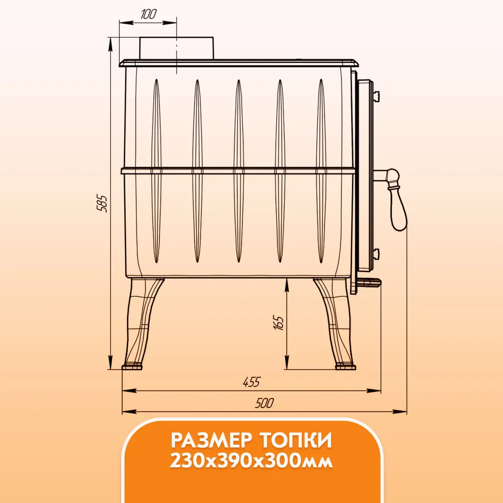 Боковые стенки конструкции металлической дровяной печи «Бахтинка» выполнены в форме радиаторов, увеличивающих общую площадь поверхности печи.